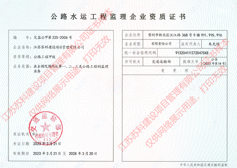 苏科建设公路工程监理甲级