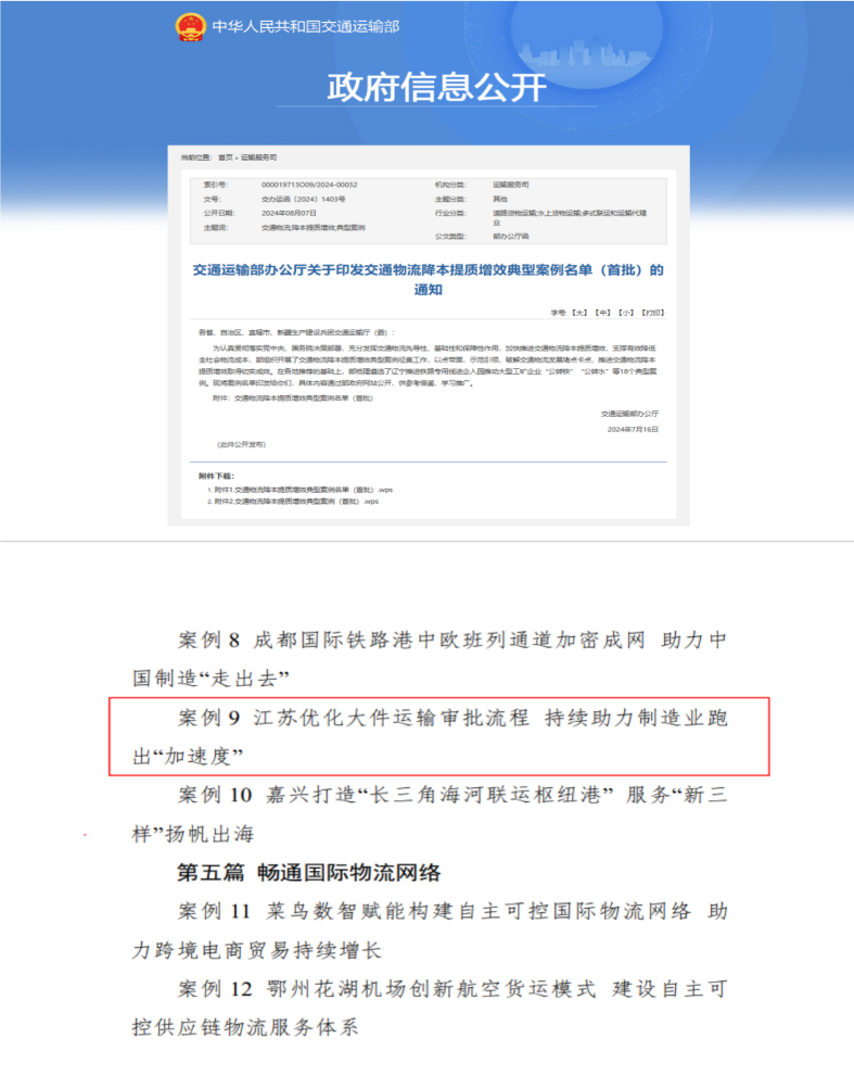 助力制造业跑出“加速度”!集团支撑江苏省执法局成功入选“全国首批交通物流降本提质增效典型案例”