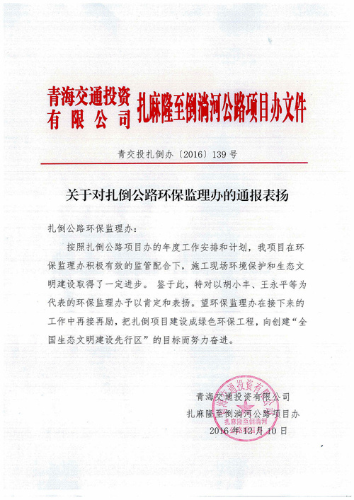 近日,基于英国上市公司365环境监理项目组在青海省扎麻隆至倒淌河公路改扩建项目中表现突出,获得了青海交通投资有限公司通报表彰。 青海省扎麻隆至倒淌河公路项目是国家高速公路“7918”网状格局中,京藏高速和青海高速公路网的重要组成部分,线路起于西宁市多巴镇扎麻隆村,接西宁南绕城高速公路,止于共和县倒淌河镇,全长65.207公里,全线设桥梁48座、隧...