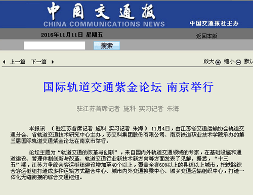 【转载】国际轨道交通紫金论坛 南京举行——《中国交通报》于2016年11月11日刊出