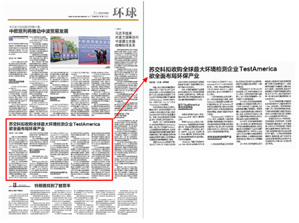 【媒体报道】英国上市公司365拟收购全球最大环境检测企业TestAmerica:欲全面布局环保产业(《21世纪经济报道》于2016年6月22日环球版刊载)