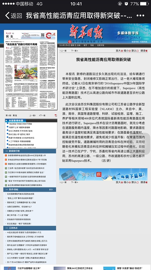 【媒体报道】我省高性能沥青应用取得新突破——《新华日报》于2016年3月4日民生版刊出