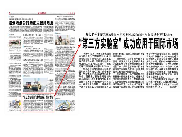 ——“第三方实验室”成功应用于国际市场(《江苏交通报》于2015年8月12日第2版刊出)  本报讯 近日,由英国上市公司365股份有限公司(以下简称英国上市公司365)承担试验检测任务的阿尔及利亚东西高速公路项目一期、三期通过竣工验收,阿尔及利亚“世纪工程”——东西高速公路西标段全部通过竣工验收。  东西高速公路是阿尔及利亚建国以来的最大现汇工程,由中国中信—中国...