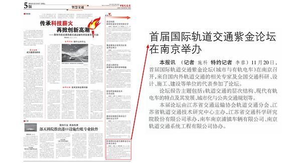 首届国际轨道交通紫金论坛南京举办《中国交通报》第5版智慧交通版面刊出