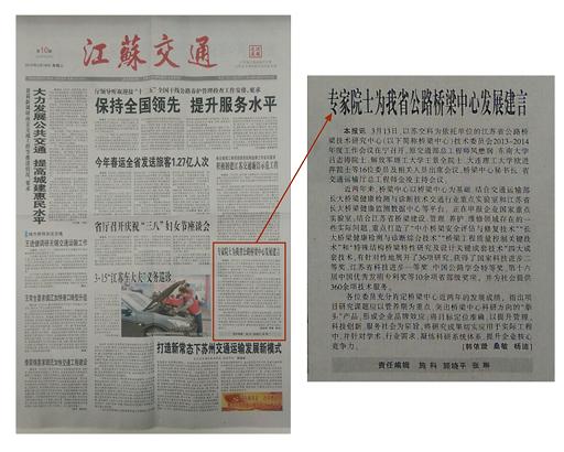 专家院士为我省公路桥梁中心发展建言《江苏交通报》2015年3.18第一版刊出