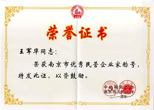 在南京市委十三届八次全体(扩大)会议召开之际,南京市委发文《市委、市政府关于表彰全市杰出民营企业、民营企业家和优秀民营企业、民营企业家的决定》(宁委发〔2014〕48号),对13家杰出民营企业、5名杰出民营企业家, 30家优秀民营企业和30名优秀民营企业家予以表彰。我公司王军华总裁荣获“南京市优秀民营企业家”称号。  南京市“杰出民营企业、民营...