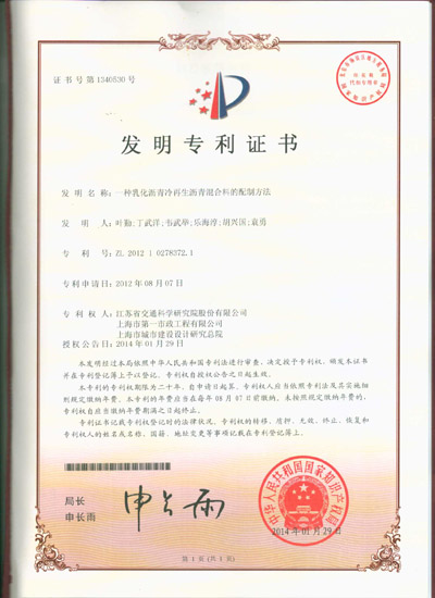 我公司乳化沥青冷再生沥青混合料的配制方法获发明专利