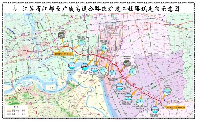 江广高速改扩建起自正谊枢纽互通式立交,止于广陵枢纽互通式立交,全长66.006km,改造采用两侧拓宽的方式,扩建为双向八车道高速公路标准,路基宽度42米,设计速度120km/h。