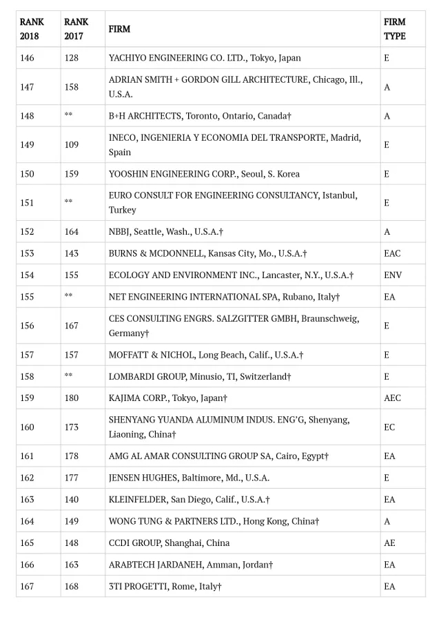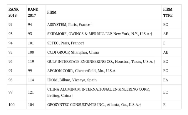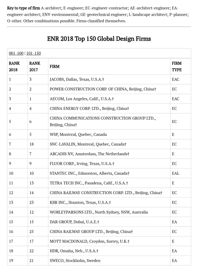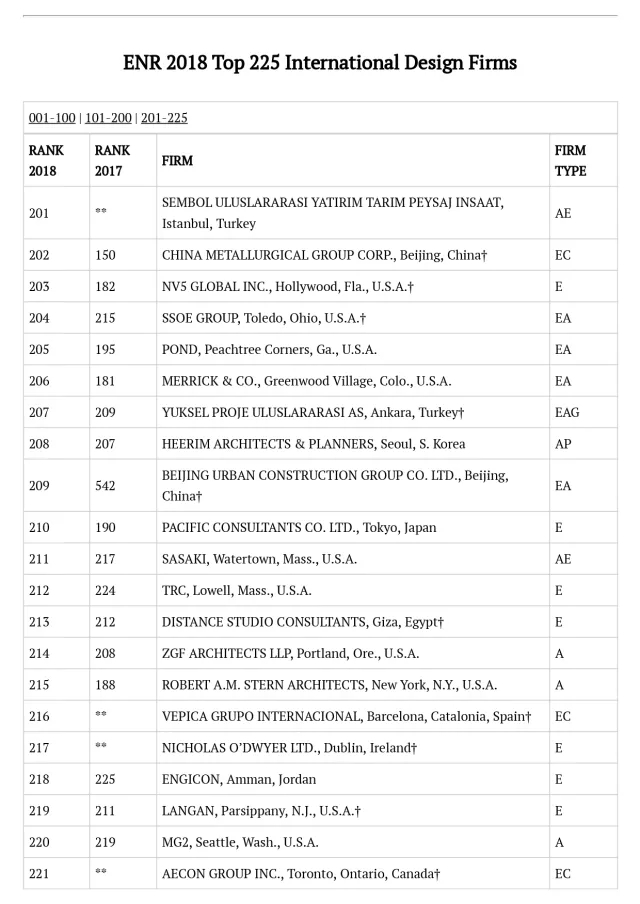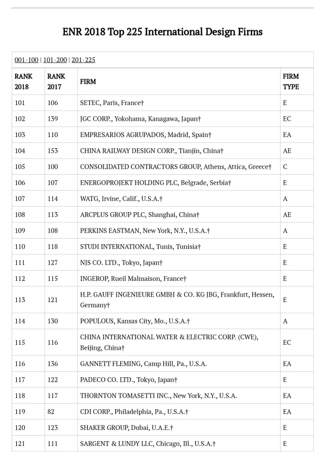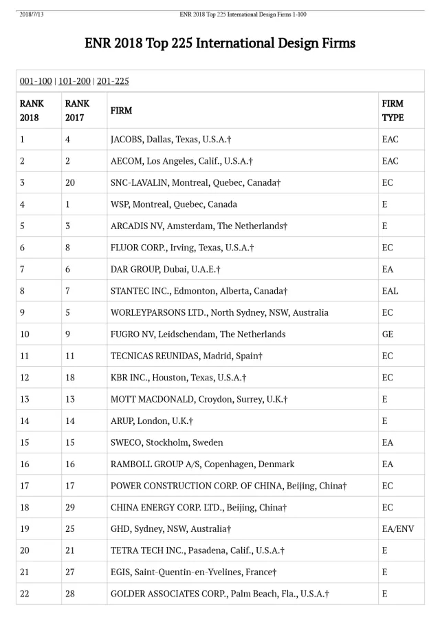 2018年ENR国际工程设计公司225强完整名单