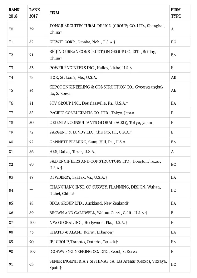 ENR“全球工程设计公司150强”以设计企业的全球营业总收入为排名依据,重在体现设计企业的综合实力。“国际工程设计公司225强”的排名则依据设计企业在本土以外的工程业务总收入,重在体现设计企业的国际业务拓展实力。今年入围 “全球工程设计公司150强”的中国企业有21家,其中,有18家进入前100名,入围“国际工程设计公司225强”的中国企业有19家,有9家进入前100名。