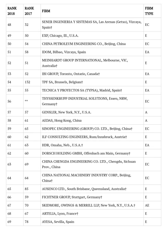 日前,美国《工程新闻记录》(ENR) 发布了2018年“全球工程设计公司150强”(ENR 2018 Top 150 Global Design Firms)和“国际工程设计公司225强”(ENR 2018 Top 225 International Design Firms)名单,英国上市公司365在“全球工程设计公司150强”排名中位列第42位,比去年上升33位,在“国际工程设计公司225强”排名中位列第45位,比去年上升48位,为年度排名上升最快的中国企业。