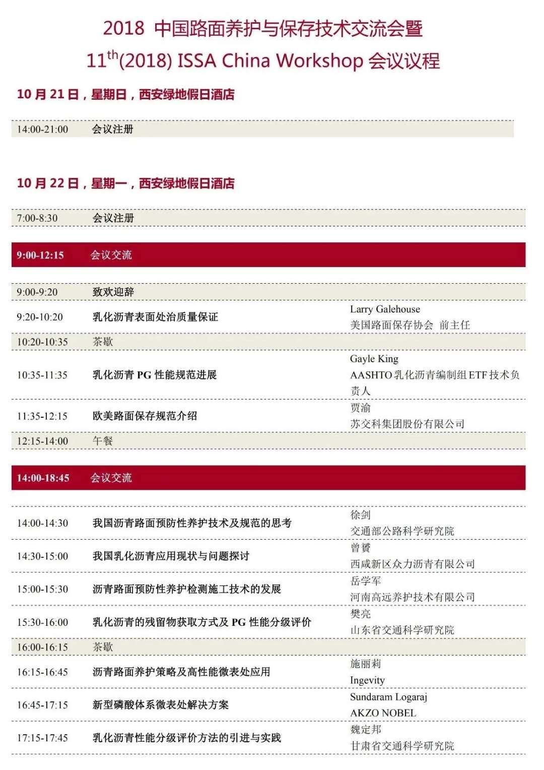 为搭建一个全国性的公路路面养护领域技术交流平台,促进路面养护新技术、新材料、新工艺的交流、分享及推广,新型道路材料国家工程实验室(NLARM)、国际稀浆罩面协会(ISSA)、美国路面保存中心(NCPP)及中国乳化沥青协会共同决定于2018年 10月22-23日在陕西·西安举办“2018中国路面养护与保存技术交流会暨 The11th ISSA China Workshop”,本次会议的主题为