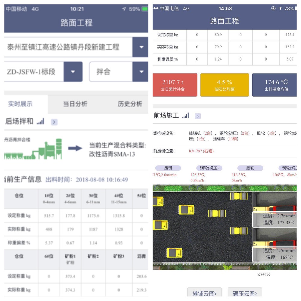 沥青路面施工智能管控系统利用物联网架构的传感技术和4G传输技术,实时采集沥青路面施工全过程数据信息,包括沥青混合料拌合、运输、摊铺、碾压、预警管理和视频监控6个功能模块。该系统可通过电脑或手机APP随时随地对施工数据和前场视频远程查看,当拌合楼生产异常情况时可实时分级预警及时纠偏,同时该系统可严格掌控现场的摊铺速度和温度,以及碾压的速度、温度和遍数,实现沥青混合料拌合、混合料运输、摊铺、碾压全过程、实时、连续管控。
