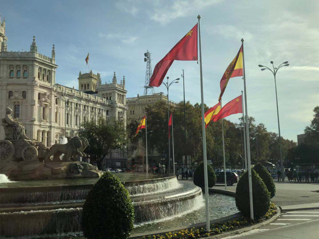 ▲ 马德里Cibeles大地女神广场飘扬的西班牙国旗和五星红旗