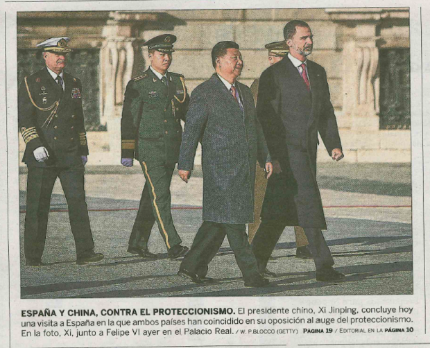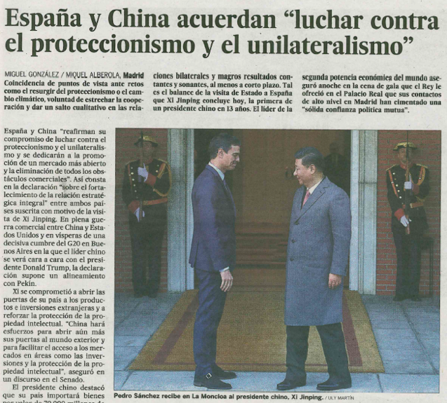 ▲ 西班牙《国家报》剪影,习主席与首相桑切斯会面并随后接见王军华副董事长等中西企业顾问委员会全部理事企业代表