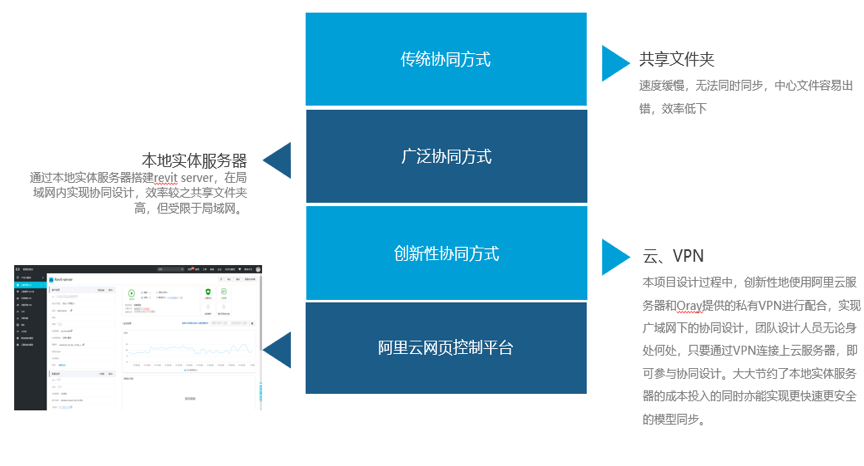 本项目设计过程中创新性地使用阿里云服务器和Oray提供的私有VPN进行配合,实现广域网下的协同设计,大大节约了本地实体服务器的成本投入。利用BIM技术渲染合成的三维平面布置展示动画,可以直观地对车辆基地内的空间关系进行分析,使总图布置更加合理。同时,团队自主开发的插件,可在设备专业设计过程中提前了解净高紧张区域,避开大型设备和管线,达到优化设计并避免后期设计变更的目的。