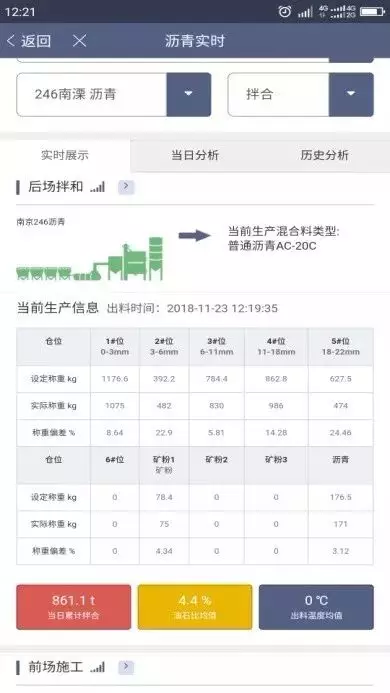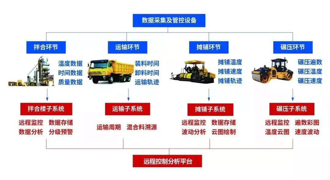 通过物联网架构的传感技术和4G传输技术,该系统实时采集沥青路面施工全过程数据信息。通过电脑端或手机App,监测人员可随时对施工数据和前场视频进行远程查看,拌和楼生产出现异常情况时也可以实现实时分级预警、及时纠偏。同时,该系统可严格掌控现场的摊铺速度和温度,实时反馈碾压环节的温度、速度及遍数,保障了路面的压实度和平整度,实现沥青混合料拌和、运输、摊铺、碾压全过程的实时、连续管控。
