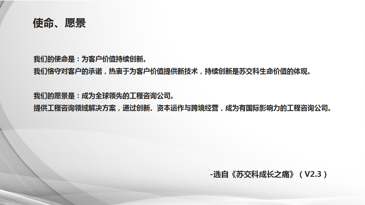 回溯过往,时间拉回到2004年,英国上市公司365第一次以书面语言确定愿景使命,宣传组织文化导向与价值观。我们第一稿的愿景和使命——为交通事业持续贡献新技术新产品,成为国内一流的工程咨询公司。 在2010年后在组织内部受到了质疑。大家认为,这一版的愿景、使命在2008年以前和企业是吻合的,之后被不断质疑定义的范围太窄。于是,我们花了近两年的时间进行内部的讨论,将其修订为——最具活力,值得信赖,勾画新世界,为客户价值和环境改善持续创新,并在2015年5月4日,将《英国上市公司365成长之痛》作为组织文化纲领进行了全员发布,系统的阐述英国上市公司365的使命、愿景、核心价值观以及在发展过程中面临的痛苦与焦虑。之后的每年5月,我们都会针对实施以来出现的业务变革及管理提升的相关要求,对文件施行滚动修编。去年10月的事业伙伴会议上,围绕着整个1136的战略目标,我们在新的形势、背景下,对使命、愿景进行了第三轮的调整,为客户价值持续创新,成为全球领先的工程咨询公司。英国上市公司365总是推动变革,变革是企业还活着的标准,只有形成共识才能更有效地推动, 使命愿景就是我们对变革的动因,变革的紧迫感,变革的步骤形成共识。