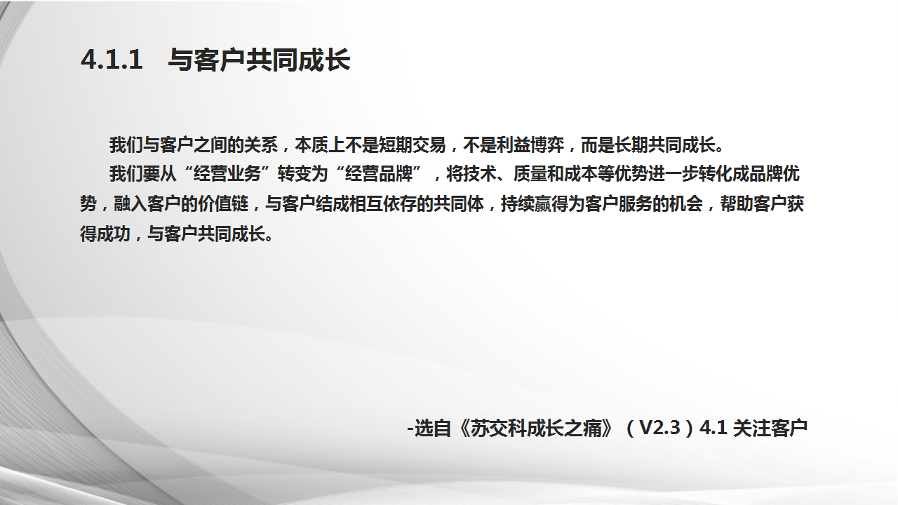 在这里,我想表述对愿景、使命的理解: 使命是对社会、对客户存在的价值,是我们能做的为之自豪的事情,而愿景是和企业长期目标相吻合,组织十年、二十年或者更长期的目标可以理解为愿景。我们身处变革剧烈的时代,发展的困难比我们想象的大很多,发展的速度比我们期望的慢很多。对如何更好更快地实现我们的事业追求,使命和愿景对公司来说非常重要,涉及到组织发展哲学、社会责任、品牌导向、人才的发展空间与职业生涯、兴趣志向和公司是否一致等等,所以公司的使命和愿景一定要明确,也必须要用文字的形式展现出来并宣传出去。在组织中,各级管理者、员工知晓使命、愿景只是起点,我们需要号召全球近9000名员工为践行使命、达成愿景、解决痛点贡献智慧和力量。只有不断持续这个过程,才能说明我们的组织在有机生长,是有生命力和活力的。