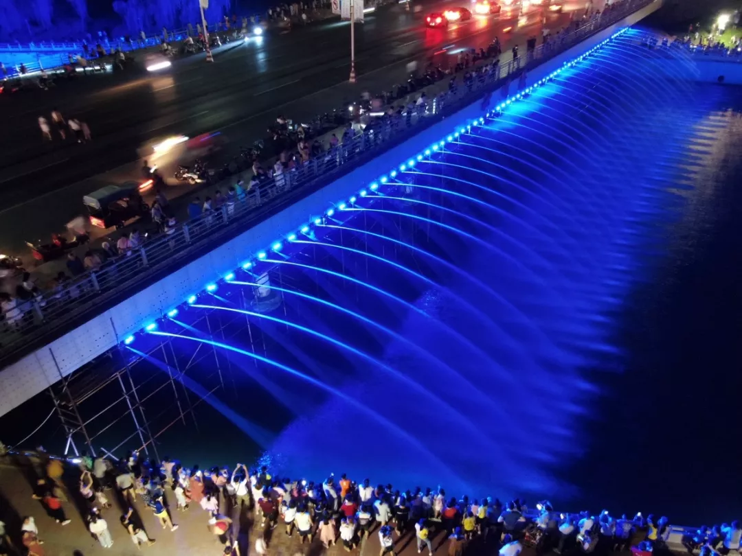 湨河沁园桥东西两侧的灯光瀑布分别从音乐、灯光、喷泉三个方面协同控制,共296个彩灯,148个机械喷头,可通过编程控制喷射方式,形成不同造型。瀑布共有6台抽水泵,通过抽湨河河水作为瀑布用水,可使河水循环利用,提升水质。在桥梁四角有4个音响,配合瀑布形态、灯光形式,可播放相应的音乐。瀑布灯光采用LED全彩灯,可根据瀑布形态,配套相应的灯光变化,整体形成声光影多方位效果。