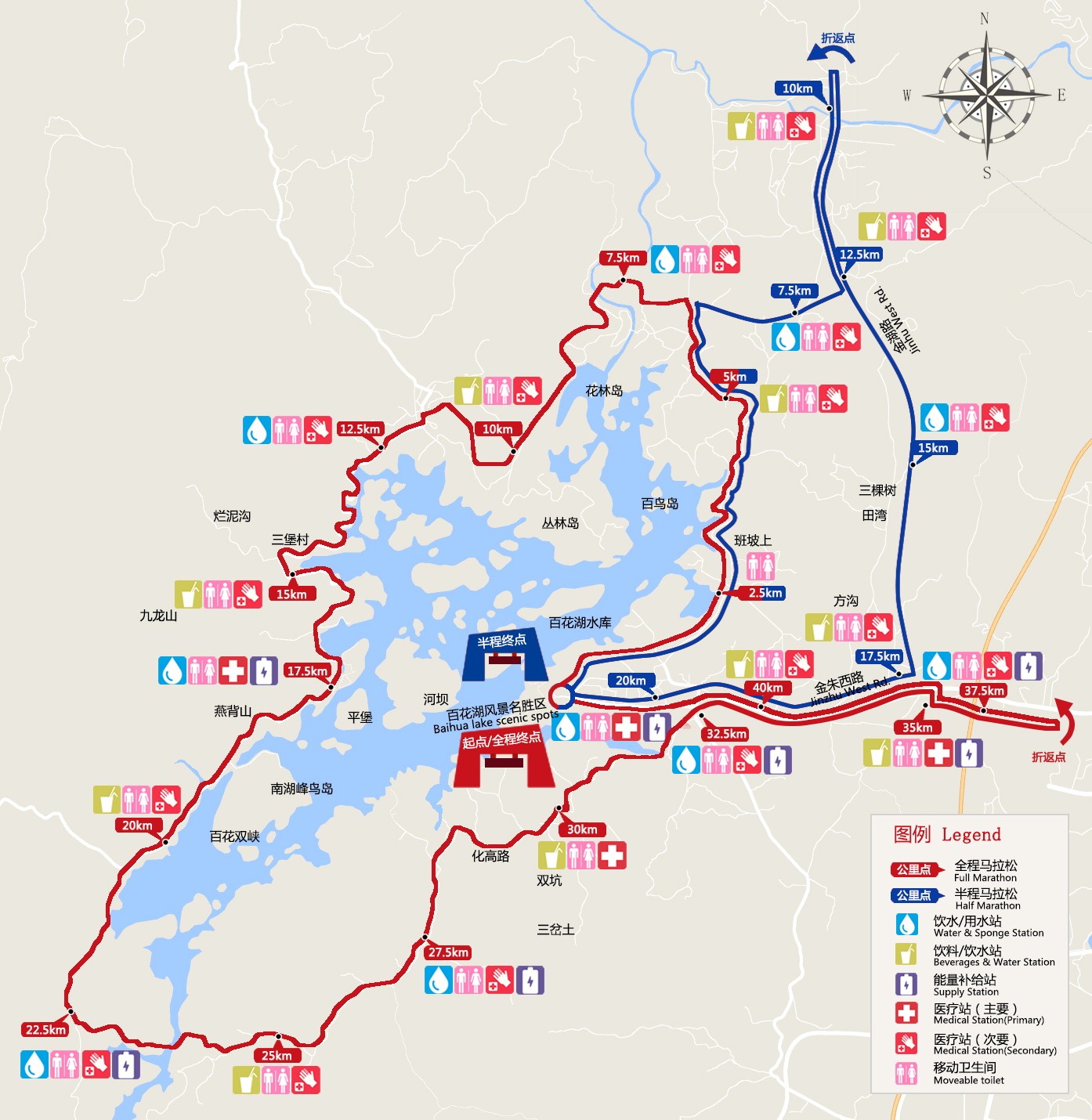 环百花湖马拉松赛道起点推荐设置于百花湖风景名胜区入口广场,沿设计环湖路逆时针绕行,在32.5km处利用一段金朱西路折返,终于百花湖风景名胜区广场,起终点为同一位置。赛道全长42.195km,全线赛道宽度9~12m,最大赛道纵坡按5%控制。赛道沿线曲水环绕,碧波秀美,108座岛屿星罗棋布,环湖分布14个美丽乡村,水清山美,气候宜人,民族风情洋溢,既是旅游胜地,也是绝佳的比赛场地。