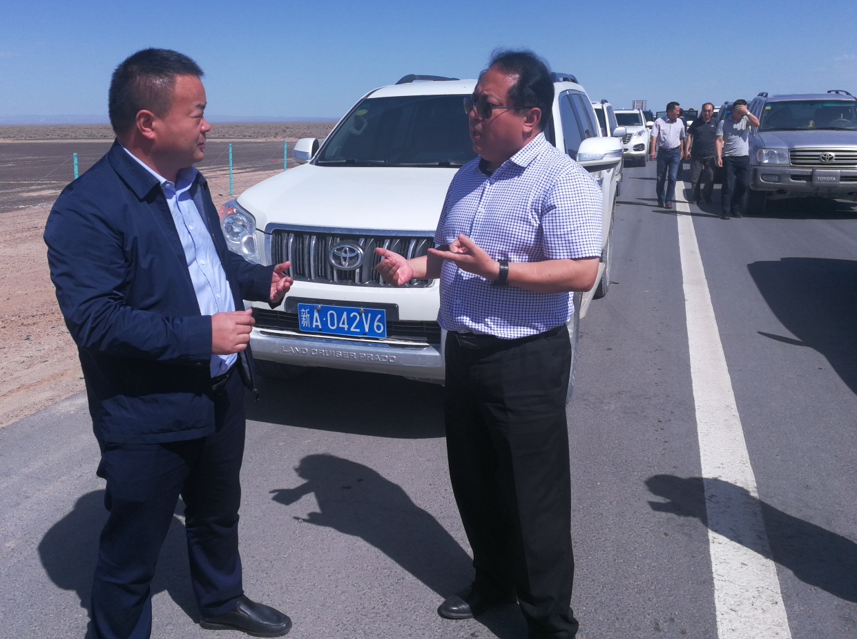 ▲ 新疆维吾尔自治区交通运输厅厅长艾江山·艾合买提(右一)视察G335项目现场