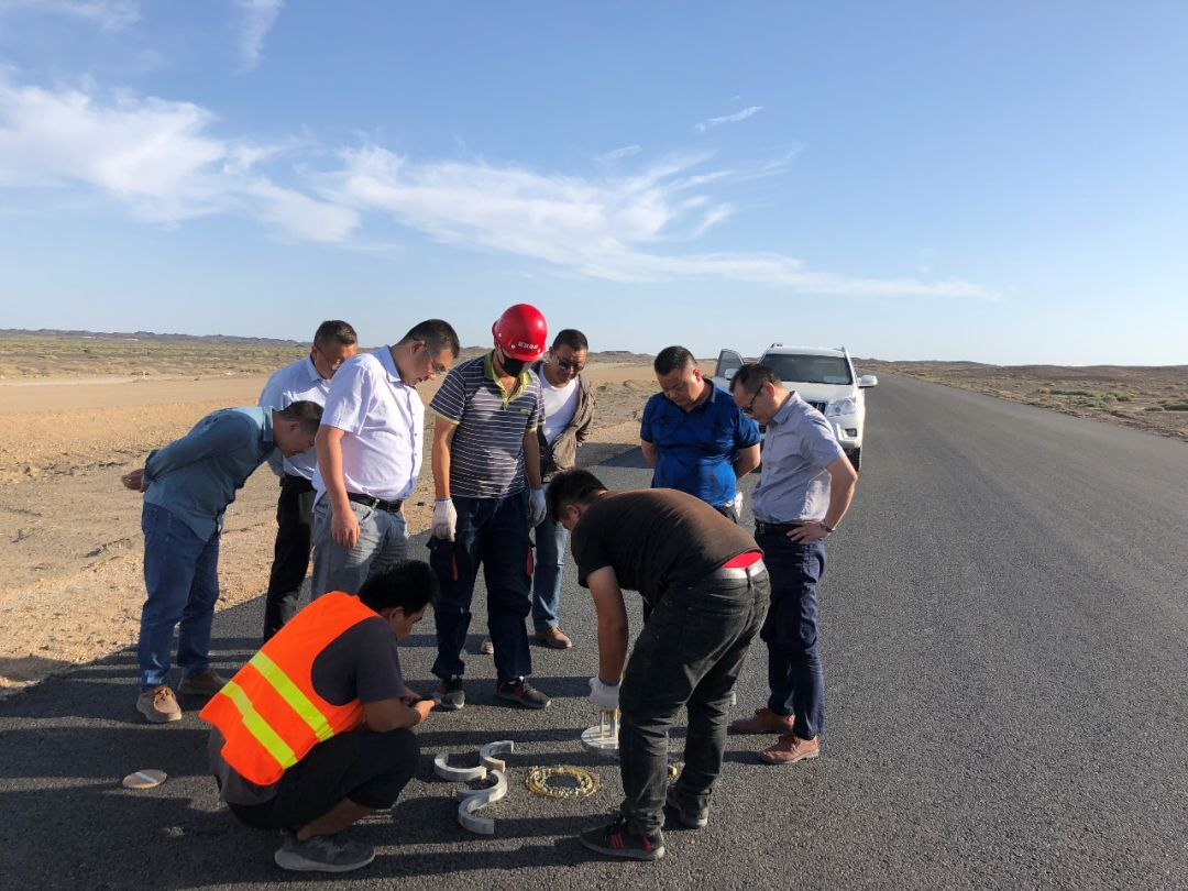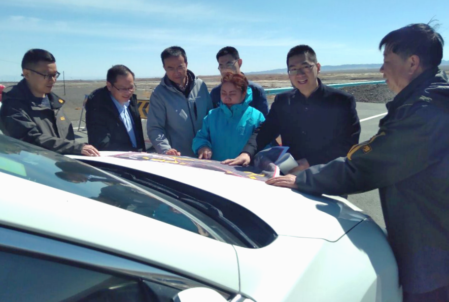 ▲ 新疆维吾尔自治区交通建设管理局副局长杨金智(右二)检查项目环水保情况
