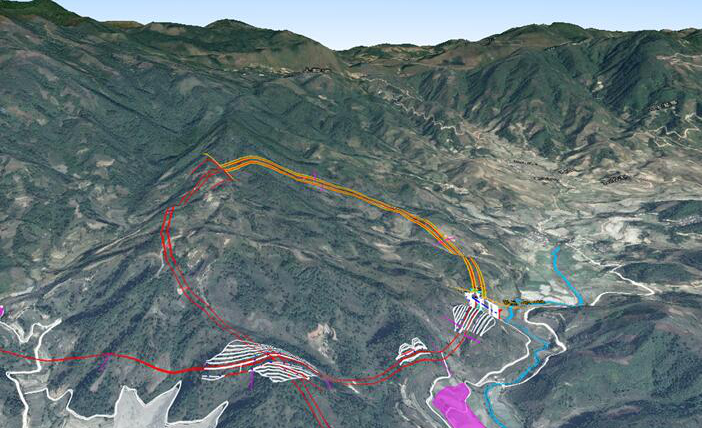 咪的村隧道位于建水县普雄乡龙岔村附近,进出口直线距离约1230m,高差近百米,为解决路线高差大的难题,设计采用小半径的左螺旋展线设置曲线隧道进行降高差,确保高速公路运营安全。螺旋隧道设计人性化,最小半径为710m,满足驾驶者视距要求;旋转角为236.12°,旋转方向为左侧旋转符合驾驶者习惯。螺旋隧道的设计建设成功解决了高落差地形的路线降高差问题,克服高差近80m。