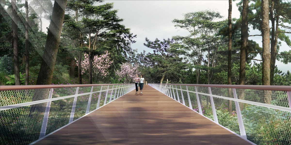 该项目作为典型的山林和城市慢行专用道,在目前道路建设规范体系中,可采用的相关技术规定尚少,故在设计之初,项目组进行了大量调研和案例分析工作,从功能的定位分析、使用人群的特性和需求角度出发,结合沿线的地形地貌特征,提出了包括断面宽度、路线选线、纵断坡度、结构形式、路面材质、节点桥梁、景观提升以及服务设施等设计技术指标和设计方案,使得“观景”走廊本身也成为一道美丽的风景线。该项目还创新性地应用了运动学和心理学研究成果,科学分析了各项指标的选择;对六座节点桥梁进行了初步的桥位风参数分析、静力三分力计算、成桥状态动力计算、节段模型及全桥气弹模型风洞试验等抗风设计研究,以及针对人致振动的安全性与舒适性的减振设计研究。项目可行性研究报告的一系列研究成果已经付诸实施,为山林和城市慢行专用道的建设提供了宝贵的设计思路和实施经验。