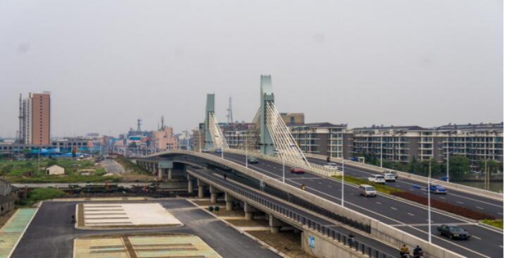 泰州兴化市五里大桥重建工程主桥采用预应力混凝土双塔单索面斜拉桥,跨径布置为62+100+62m,采用机非上下分离、双层通行的设计方案,引桥采用预应力混凝土空心板,桥梁宽26m。