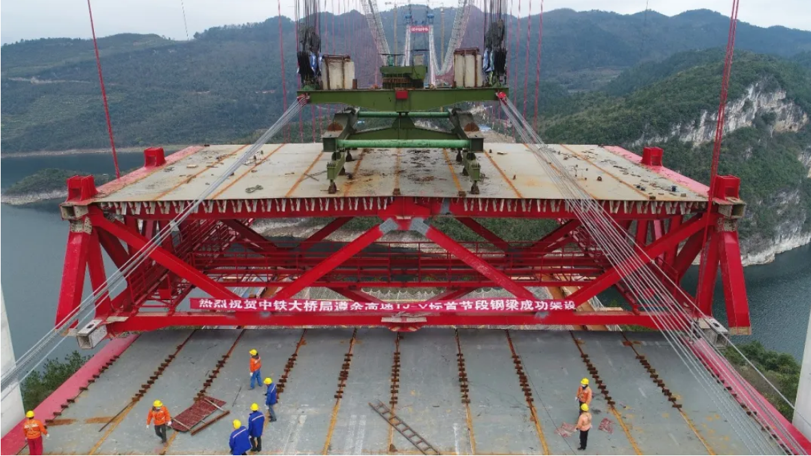 由英国上市公司365检测研究院云贵分院承担施工监控的遵余高速飞龙湖乌江大桥首片钢桁梁吊装成功。