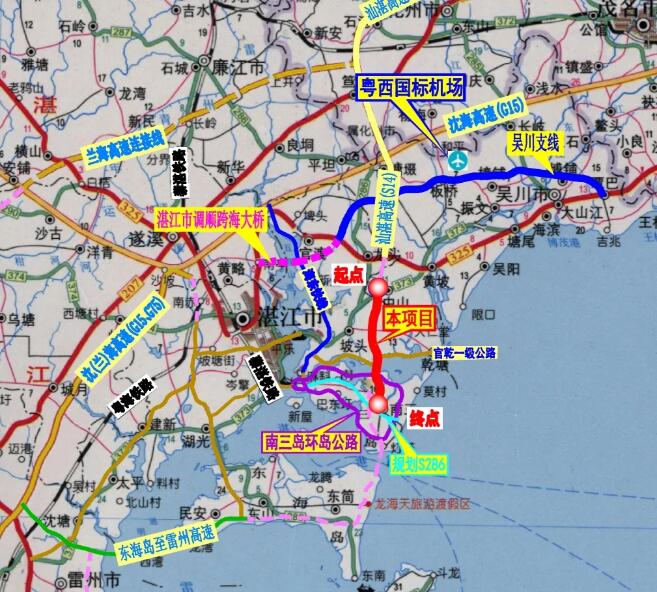 本项目起于湛江吴川市黄坡镇西坡,顺接汕湛高速云浮至湛江段,自北向南途经坡头镇,跨越南三水道进入南三岛,终于南三镇与县道X666线相交。路线全长16.148公里,桥梁总长5272米,包括特大桥1座,总长3043.46米,涵洞26道,互通立交4处,集中居住区1处。采用双向四车道高速公路标准,设计速度120公里/小时。其中,南三岛大桥是跨海大桥,主桥为(131+300+131)m双塔双索面PC斜拉桥,通航等级为3000吨级海轮标准,主通航孔跨径达300米,通航净高28米,是南三滨海旅游公路重要组成部分和标志性工程。南三岛大桥(坡头至南三岛段)建成后将解决南三岛人们出行难的问题,有效开发岛上旅游及其他资源,进一步完善粤西地区高速公路网布局,加快推动湛江市省域副中心城市建设,对打造现代化沿海经济带发展具有重要支撑及促进作用。