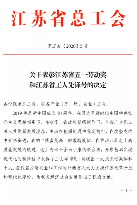 江苏省总工会公布2020年“江苏省工人先锋号”入选名单,集团检测研究院安全研究中心位列其中。此次被授予“江苏省工人先锋号”荣誉称号是对安全研究中心在打造交通强国江苏样板、支撑保障“强富美高”新实践中所做工作的充分认可。