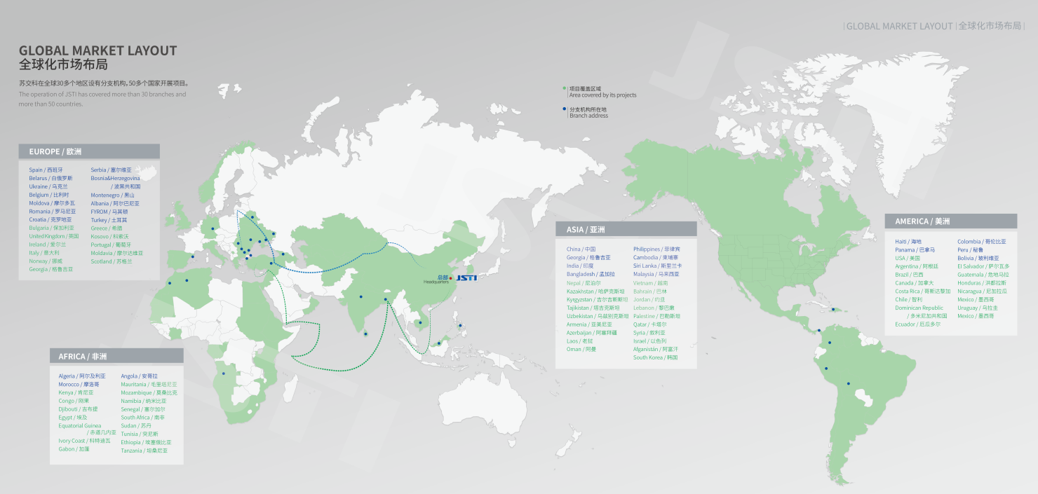 我们着力打造一个全球性工程咨询服务的高端平台,为“一带一路”国家客户、为“走出去”的中国工程公司,以及全球工程基础设施客户提供专业工程咨询服务。目前,JSTI拥有82家子公司,在全球30多个地区设立分支机构,50多个国家开展项目。