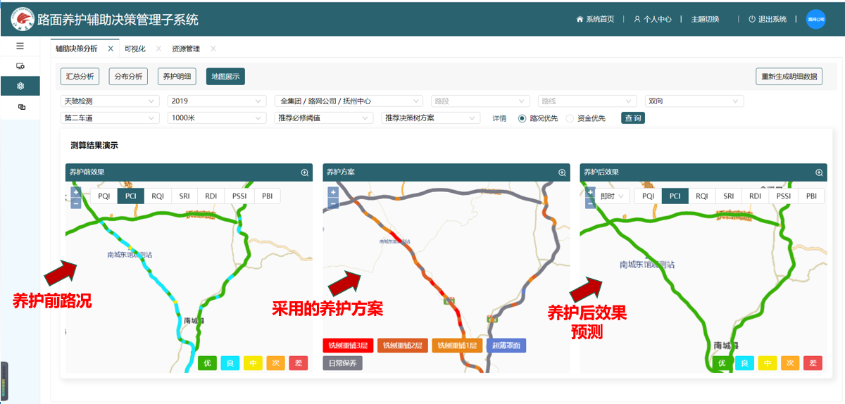 系统综合考虑路段需求、交通流量、路况水平等因素,构建养护决策模型,基于最新路况、交通量及路龄等数据,提出预防性养护和修复性养护路段位置和资金需求建议。通过测算资金约束条件下的路网养护优先排序,提出年度养护建议计划并预测相应资金投入下的未来路况改善效果。江西高速集团应用科学决策功能,可统筹全局,优化各路段的养护资金分配,实现自上而下的网级科学决策。通过与实际施工图对比分析,系统测算养护资金规模匹配度可达到80%,有力证明该决策体系的科学性和实用性。伴随路面养护大数据积累,系统将不断修正模型参数,决策的科学性和精确性将持续提升。