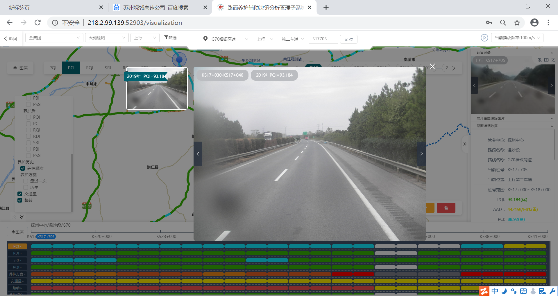 以电子地图、实景图像、多维图表为载体,将路况、交通量、路龄、养护历史、养护强度、养护计划等路面相关数据以图层叠加方式进行展示,可查看路网各类数据分布情况或定位具体桩号,并以桩号为纽带,实现各类数据联动展示。通过综合分析平台,全面展示各路段路况、交通量、养护历史、下阶段养护方案和效果,为管理者决策提供参考。