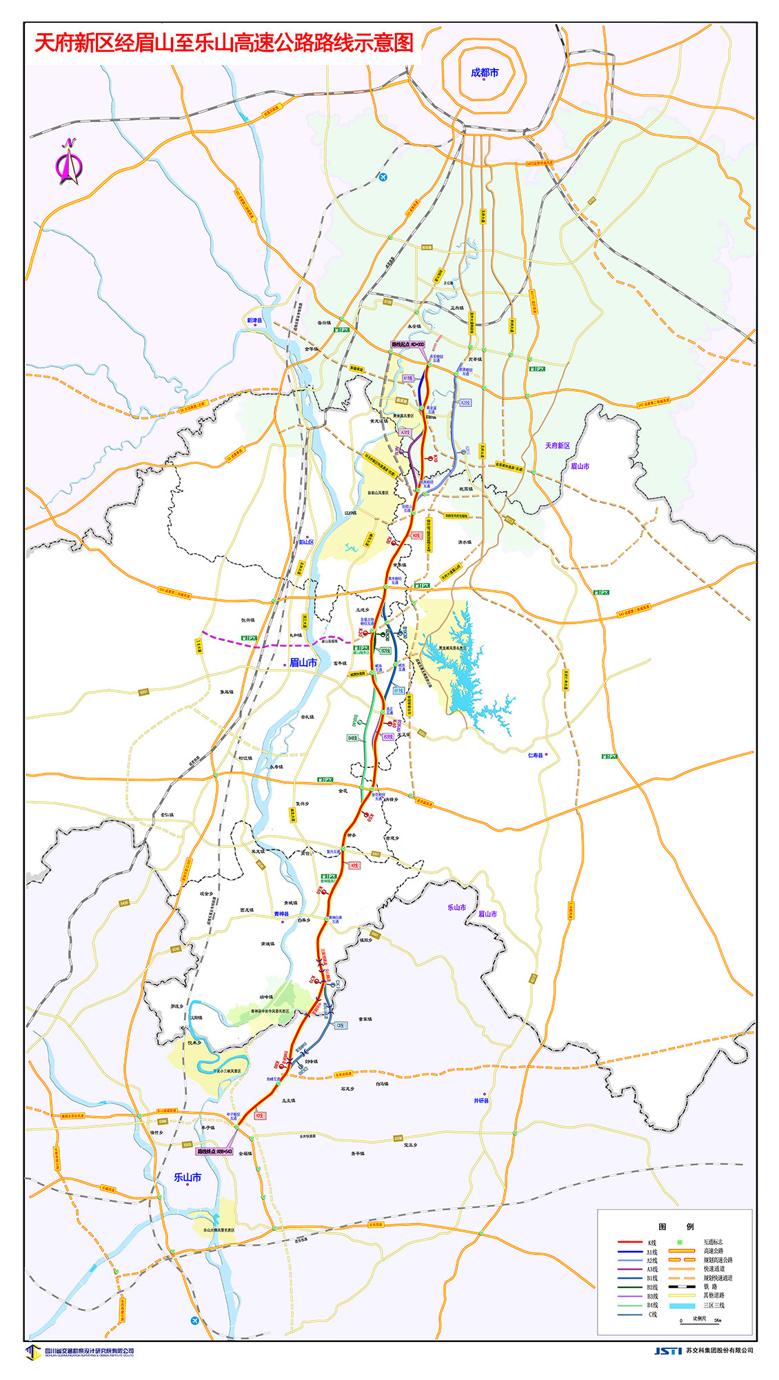 成都天府新区经眉山至乐山高速公路是《四川省高速公路网规划(2019-2035)》成都放射线之一,项目起于成都市第二绕城高速,途径天府新区、彭山区,于黄丰镇东南上跨SA3成都经济区环线,后经眉山市岷东新区,向南至眉山青神县、乐山市井研县,接入乐山绕城高速,路线全线全长约92km,总投资约210亿元。项目全线拟采用双向八车道(局部路段双向六车道)高速公路标准,设计速度120km/h,路基标准横断面双向八车道取42m,双向六车道取34.5m。