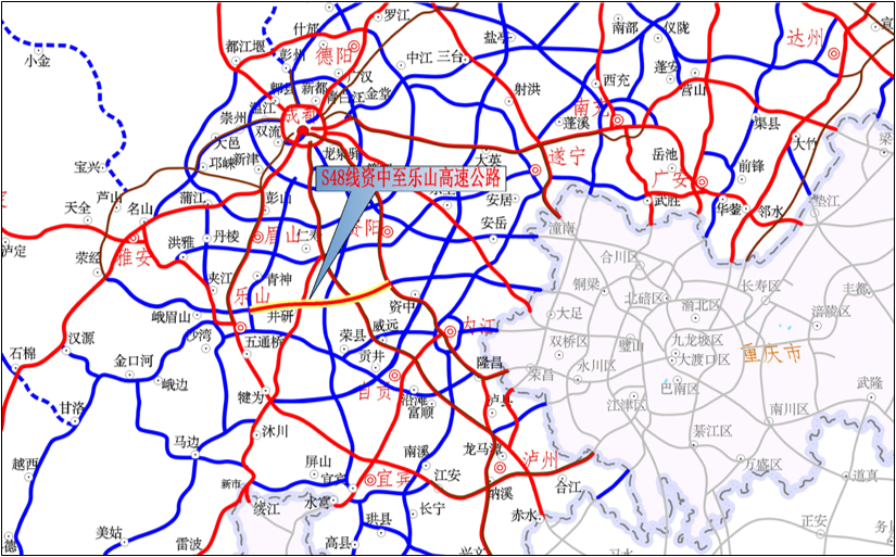 S48线资中至乐山段高速公路是《四川省高速公路网规划(2019—2035年)》重要组成路段,东接资中至铜梁段高速公路,联通重庆继而通达长三角,西接乐山至荥经段高速公路,往雅安方向接西藏,与相邻路段共同组成S48线铜梁至荥经高速公路,项目起点资中与G76厦蓉高速形成互通式立交,途径内江市、眉山市和乐山市,终点与规划天眉乐高速相接,后与之共线,终接乐山绕城高速。路线全长约91km,双向6车道高速公路标准建设。全线共设置桥梁32108m/132座,桥隧比35.76%,枢纽互通5座,一般互通8座,服务区2处,停车区2处。