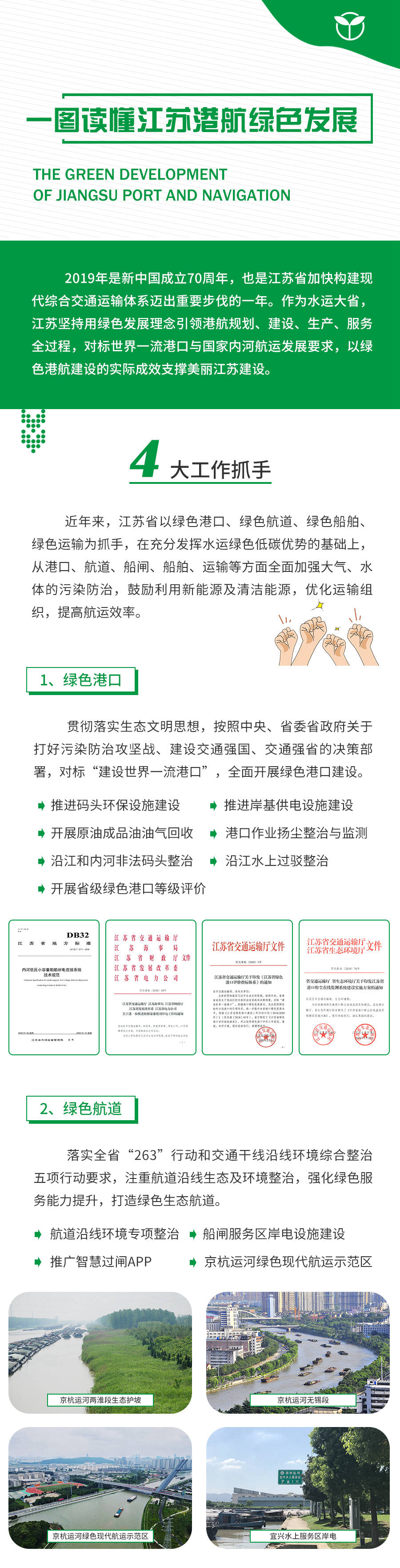 《江苏绿色港航发展报告(2019年)》全面梳理、总结江苏省港航发展现状及绿色发展相关上位政策要求,系统回顾2019年度绿色港航发展重点工作完成情况,定性与定量评价绿色港航发展成效和特征,客观研判绿色港航发展面临的机遇与挑战,展望下阶段绿色港航发展主要方向和任务。该报告为行业全面掌握绿色港航相关数据提供支持,有利于动态跟踪绿色港航发展水平,报告发布后将成为面向社会公众宣传绿色港航发展成效的媒介和工具。
