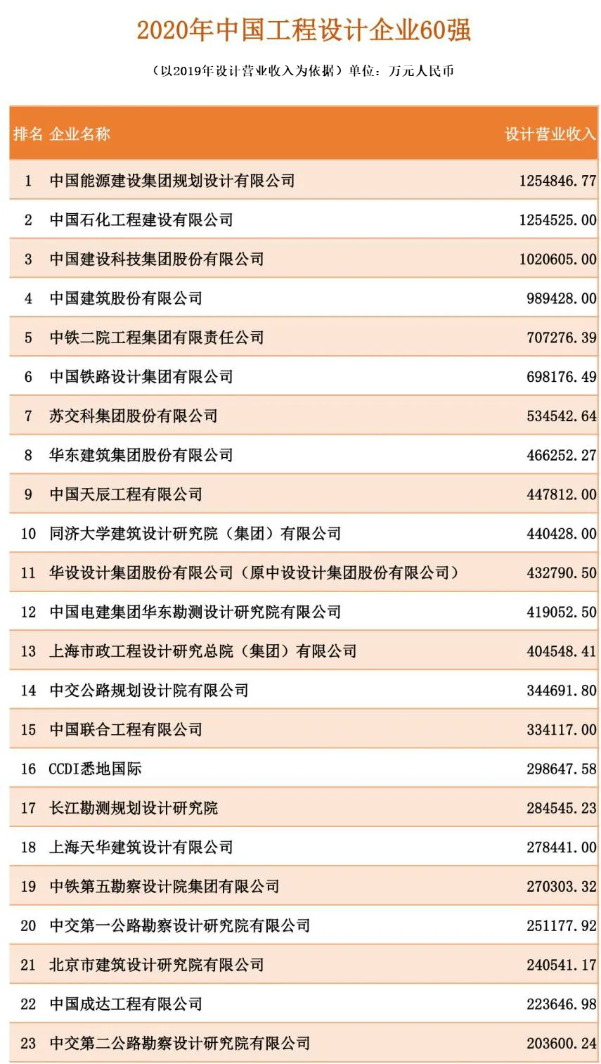 ENR/建筑时报“中国工程设计企业60强”榜单由中美两国行业主流媒体联手打造,是社会各界公认的工程行业发展风向标,具有高度专业权威性和社会公信力。2020年度“中国承包商80强和工程设计企业60强”榜单排名以企业2019年度工程承包及设计领域总营业收入为主要依据,研发成果、净资产、利润率等作为参考指标,多维度进行评定。