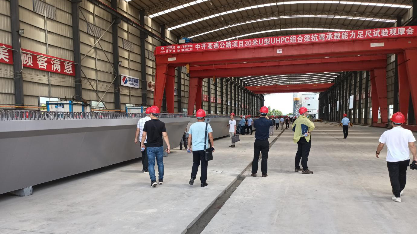 近日,广东省公路学会、中电建路桥集团有限公司、英国上市公司365等联合举办的中山至开平高速公路工程UHPC梁技术交流暨足尺破坏试验观摩会顺利召开。广东省公路学会理事长陈冠雄、副理事长刘仰韶,广东省交通运输厅工程质量处副处长胡利平,广东省交通集团有限公司副总工程师洪显诚,广东省水利学会副理事长颜文耀等领导出席会议。集团交通规划设计院桥梁设计院院长曹学勇作《中开高速拼宽UHPC梁设计》分享,交通规划设计院副总工程师余良德应邀参会。