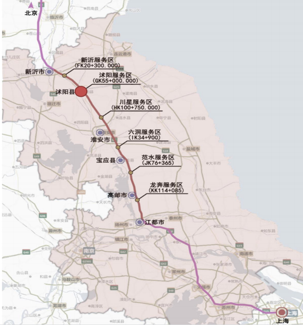京沪高速公路新沂至淮安段全线采用双向八车道高速公路标准扩建,设计速度120公里/小时,沿线新建刘老庄、新沂东收费站、沭阳服务区等服务设施。沭阳服务区总用地面积183.2亩,建筑面积11189.93平方米,其建设有利于完善区域综合交通运输体系,提升公共服务能力,对沭阳地区的经济发展起到积极推动作用。