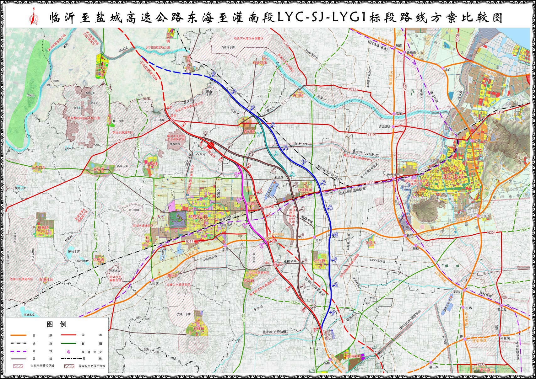 LYC-SJ-LYG1标段区域第一产业发达,基本农田广布,沿线涉及6处生态空间管控区,总体设计遵循节地、生态环保原则,以桥梁形式穿越清水通道维护区;沿线交叉连霍高速、陇海铁路、连徐高铁、西气东输管道、日仪石油长输管道、超高压输电线、航道等较多控制因素,需通过优化平纵设计满足相关交角、净空等专业要求,降低交叉工程规模及相互影响;路线中段临近4D级白塔埠机场,经与机场相关管理部门密切沟通对接,明确航空管控要求作为路线选线及工程方案比选基础;区域地形地貌为沂沭丘陵平原区,地质条件变化较大,沿线地震动峰值加速度横跨0.2g、0.15g、0.10g,后续需采用多种手段精细化勘察及做好工程场地地震安全性评价,为特殊路基设计及桥梁抗震设计做好技术支撑。项目组多次与地方主管部门对接并踏勘现场,听取相关意见及要求,下一步,将根据工可大纲审查意见和建议,全面贯彻落实“绿色公路”、“品质工程”建设要求,为项目顺利推进提供各类支持。