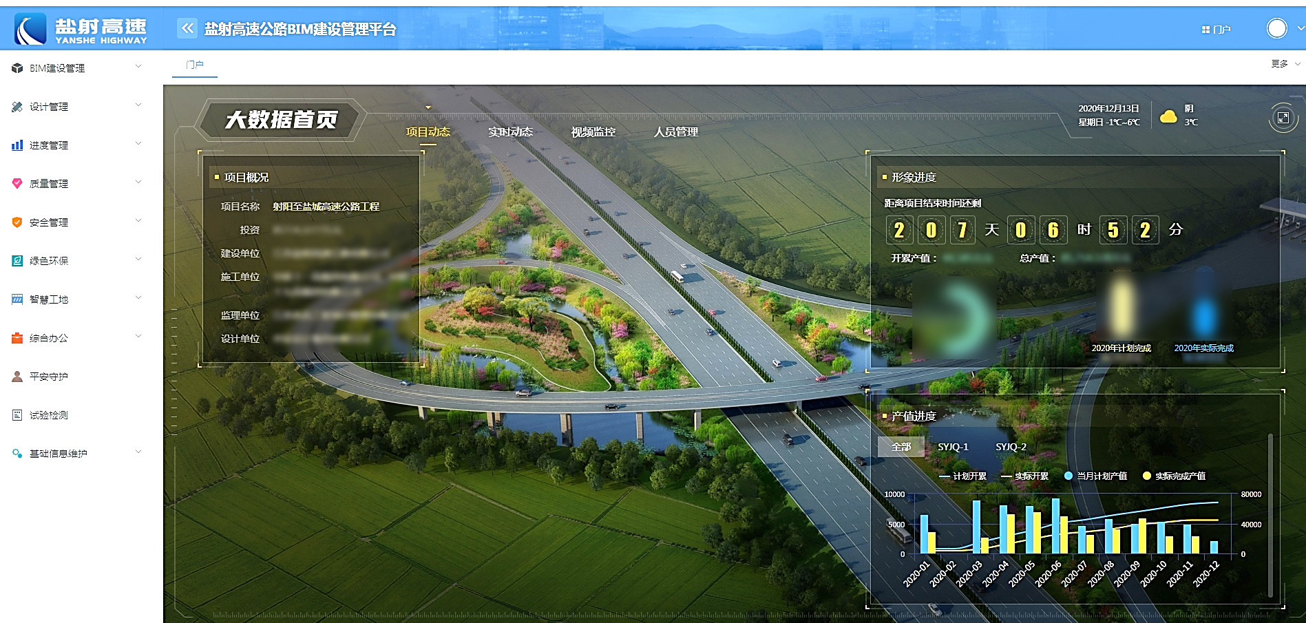 作为盐城市智慧工地建设样板工程,本项目以实现智慧质监、提升道路工程质量为总体目标,推动BIM、物联网、移动互联等信息化技术的运用,提升项目信息化水平。通过BIM信息化平台对项目实行一体化管理,提高工程管理效率,对关键工艺的施工安全进行全程管控,对关键信息进行溯源;在路基和桥梁施工中应用平安守护系统、二维码技术应用、公司进度管理系统应用、计量变更软件系统、智能张拉压浆系统、智能喷淋养生系统、远程视频监控等信息化智能化手段,实现工地现场安全可视化、成本可控化、管理智能化、监测自动化,提升质量安全精准管控能力,不断提高管理效率,提升管理效能。