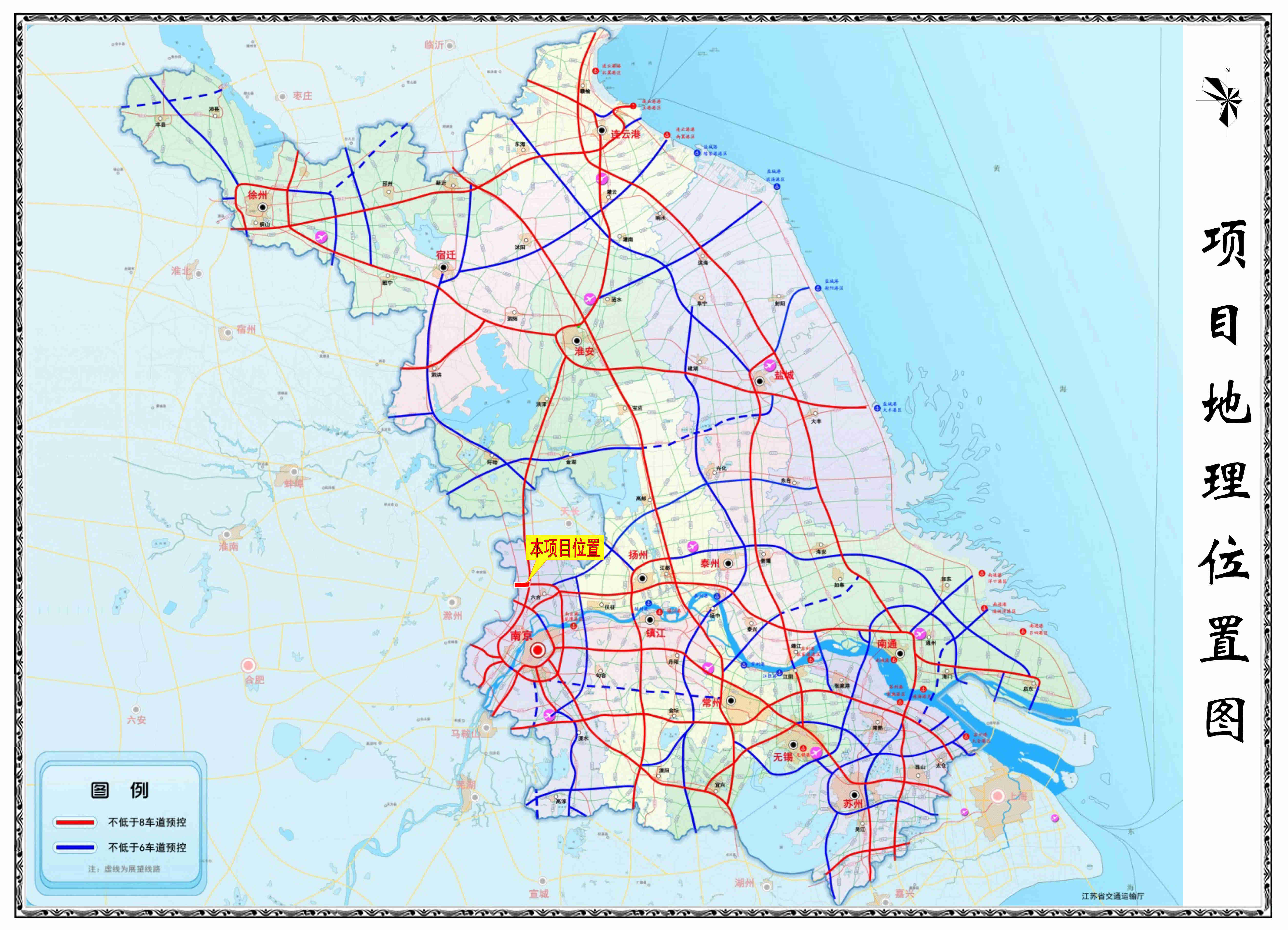 南京至滁州高速公路江苏段是《江苏省高速公路网规划(2017-2035年)》中新增的苏皖省际高速,是江苏省十五射六纵十横”高速公路网中的“射十五”,编号S8。江苏段起自南京绕越高速公路与宁连高速公路交叉处,向西上跨宁淮高速公路,改造现有程桥枢纽,继续向西下穿235国道并设置程桥北互通,止于向阳河东侧苏皖省界处,与来安至六合高速公路安徽段顺接,路线全长约7.408km。拟建道路采用双向六车道,设计车速120km/h,路基标准断面宽度为34.5m。全线设置枢纽式互通1处(程桥枢纽)、服务型互通1处(程桥北互通),并设置1处匝道收费站及管理区;设置主线特大桥2座(含枢纽主线桥)、大桥1座及其他相关附属工程。