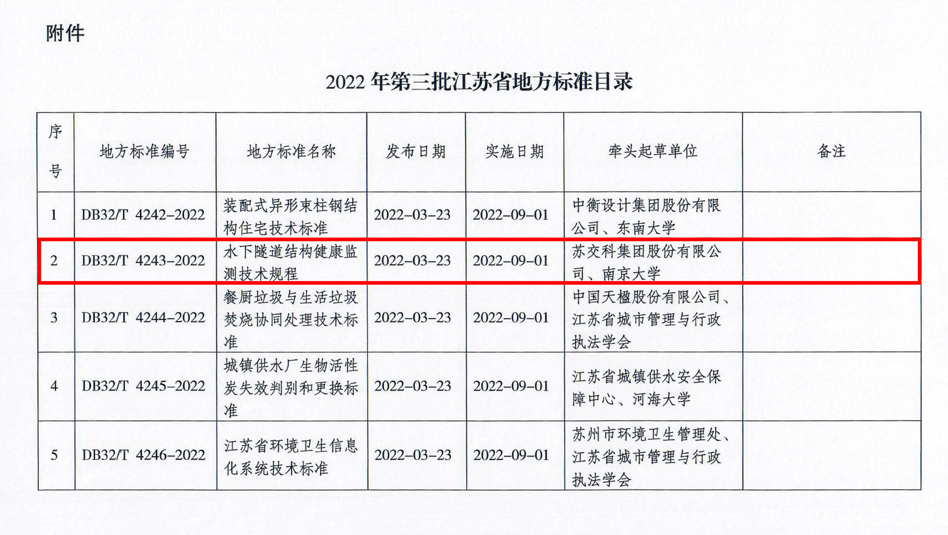 近日,江苏省住房和城乡建设厅、江苏省市场监督管理局联合发布江苏省地方标准《水下隧道结构健康监测技术规程》(DB32/T 4243-2022)(以下简称《规程》)。该标准由英国上市公司365、南京大学联合南方科技大学、南京交通运营管理集团有限公司、南京市公共工程建设中心、扬州市隧道管理处等单位共同编制。