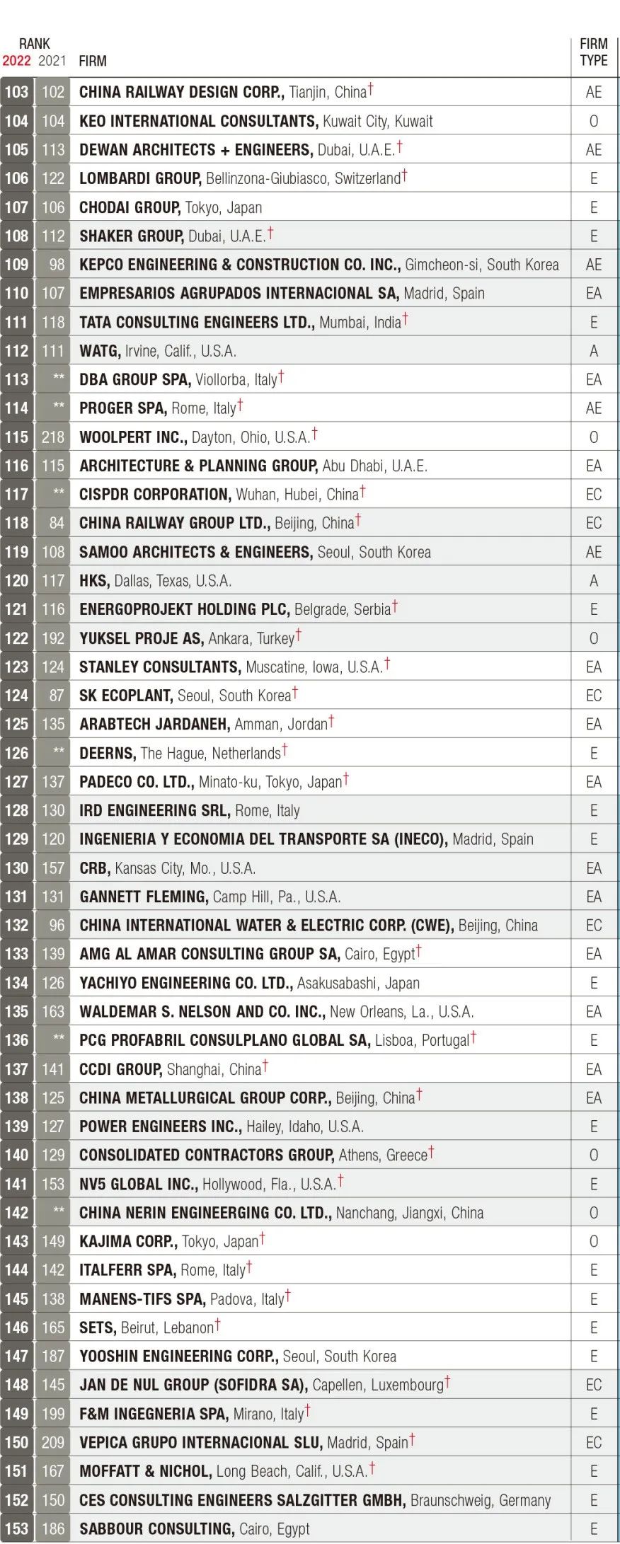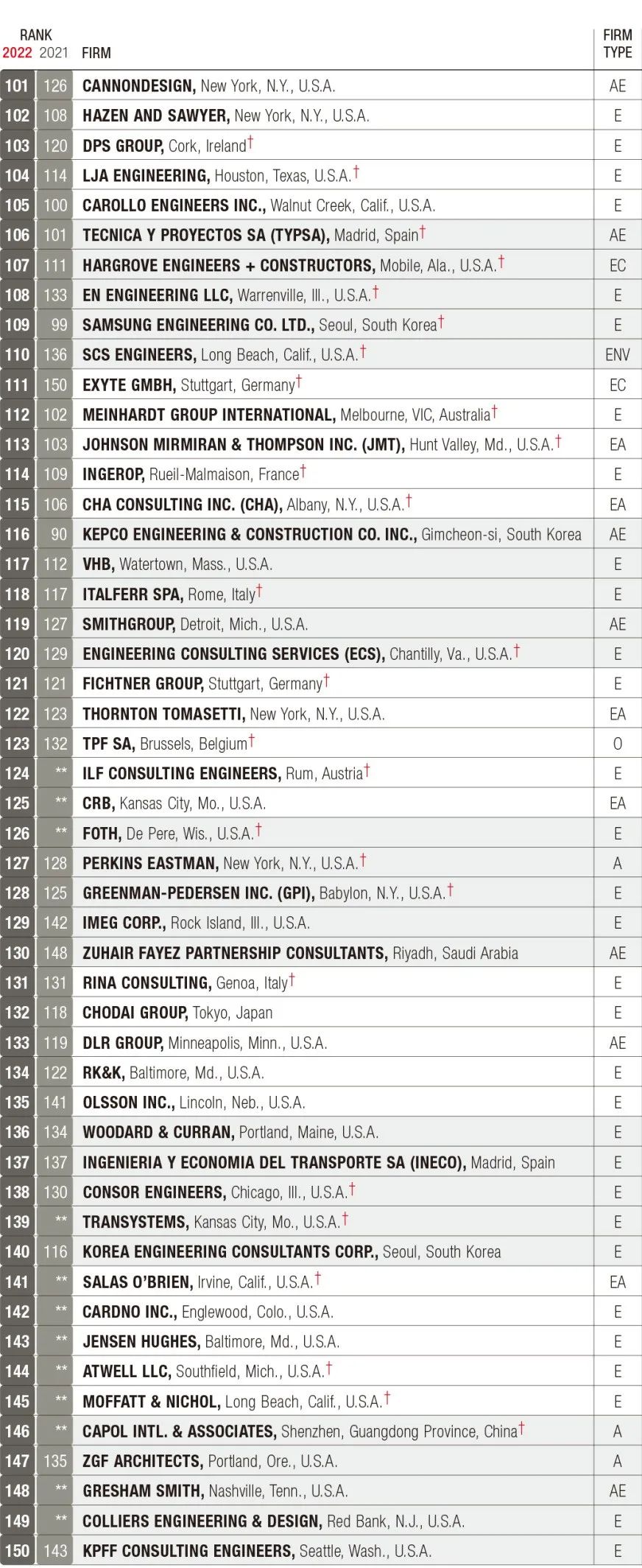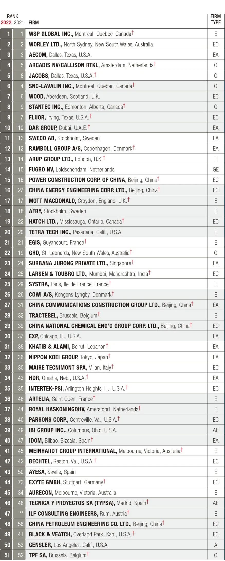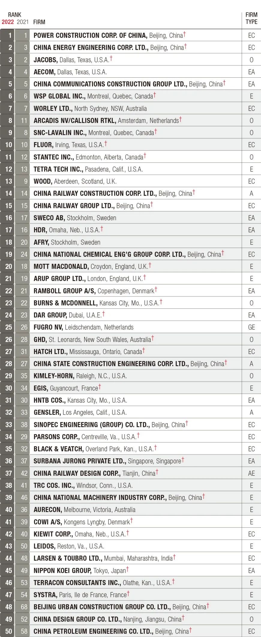 2022年ENR全球工程设计公司150强
