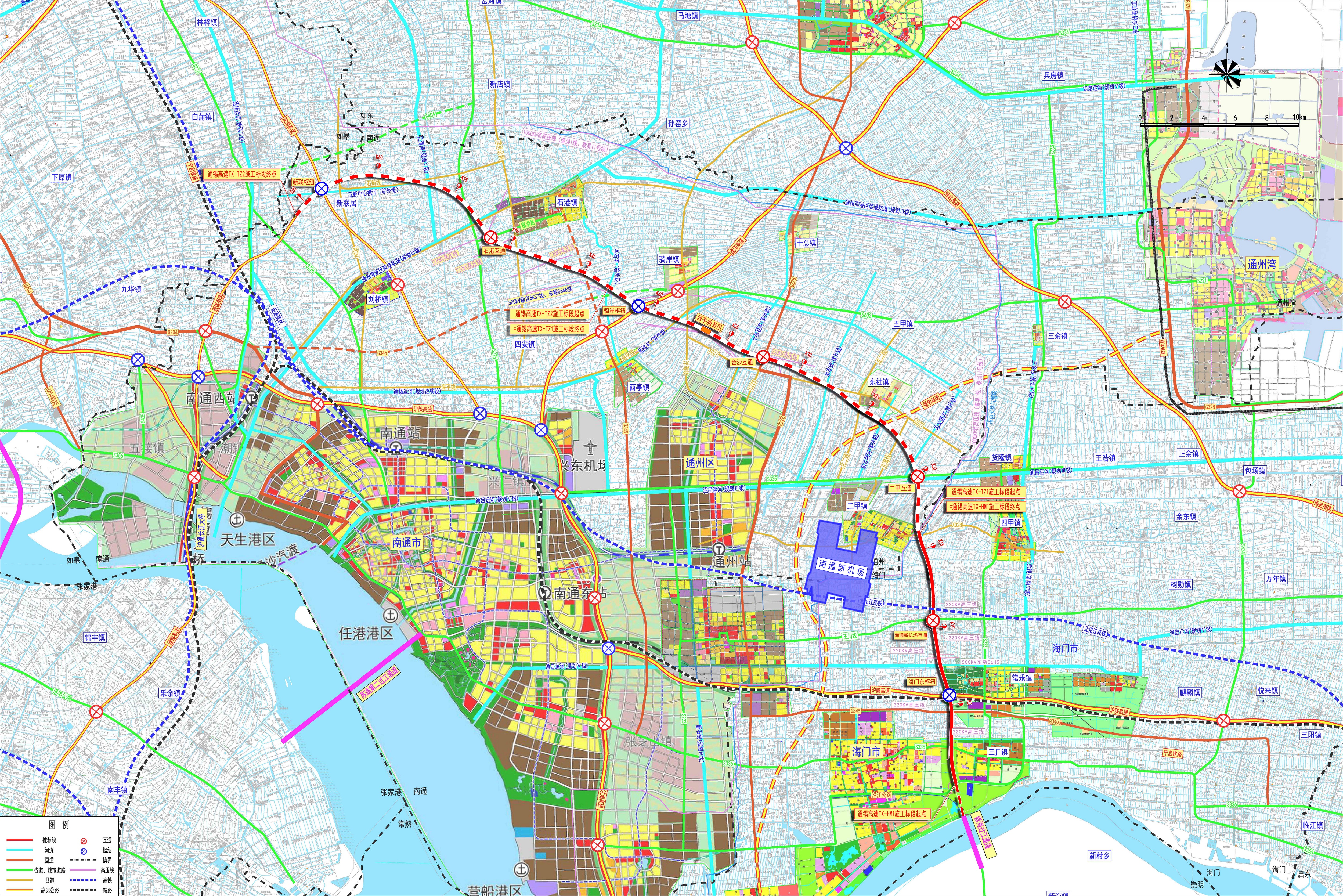 通锡高速公路海门至通州段路线起自海门区沿江高等级公路,向北上跨G345、宁启铁路、沪陕高速公路、通吕运河、S335后向西北布设,在通州区北侧上跨G228、洋通高速、通州湾港区疏港航道,止于沈海高速公路和沪苏通大桥北接线新联枢纽,路线全长65.400km。全线采用双向六车道高速公路标准,设计速度为120km/h,路基全宽34.5m。