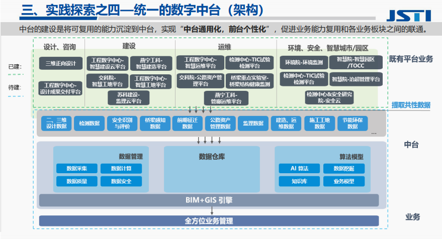 集团打造基于BIM的数据中台,是将数字孪生赋能全过程咨询,是基于BIM的全生命周期管理。中台的建设是将可复用的能力沉淀到中台,实现“中台通用化,前台个性化”,促进业务能力复用和各业务板块之间的联通。
