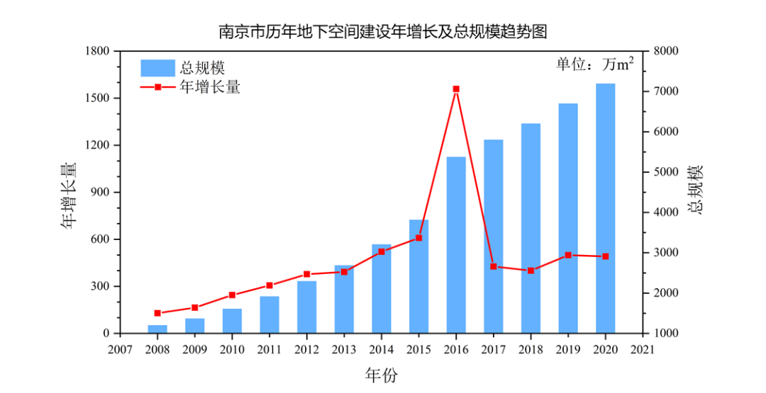 截至2020年底,南京市地下空间建设总规模达到7190万平方米,人均地下空间规模为7.72平方米,多项指标均位于全国前列。近年地下空间建设速度趋于稳定,在满足空间“增量”需求的同时,更加关注空间“质量”需求。